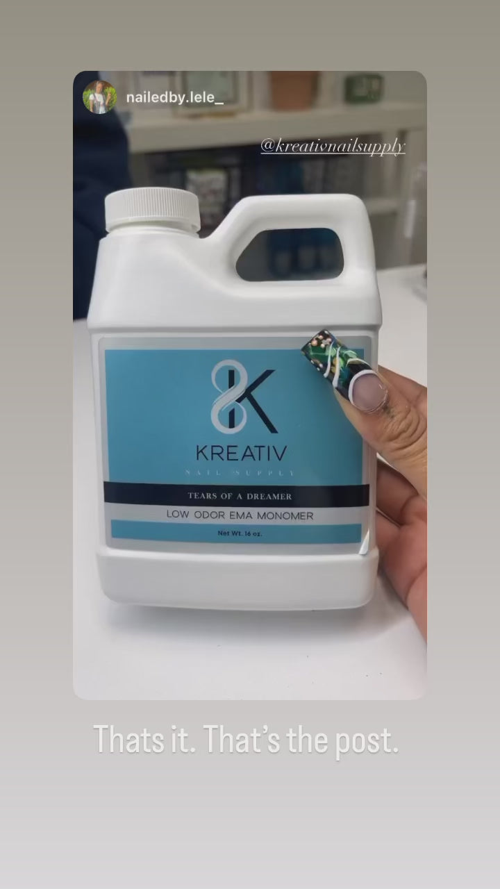 Kreativ Nail Supply is proud to present our world-famous Tears of a Dreamer EMA Liquid Monomer. All monomer packaging have been upgraded to exceed NC Cosmetic Stateboard manufacturer label and sealed standards. This is a high-quality, low-odor monomer, with no MMA. This is a medium setting monomer. Sold in 2oz, 16oz and Half Gallon quantities.