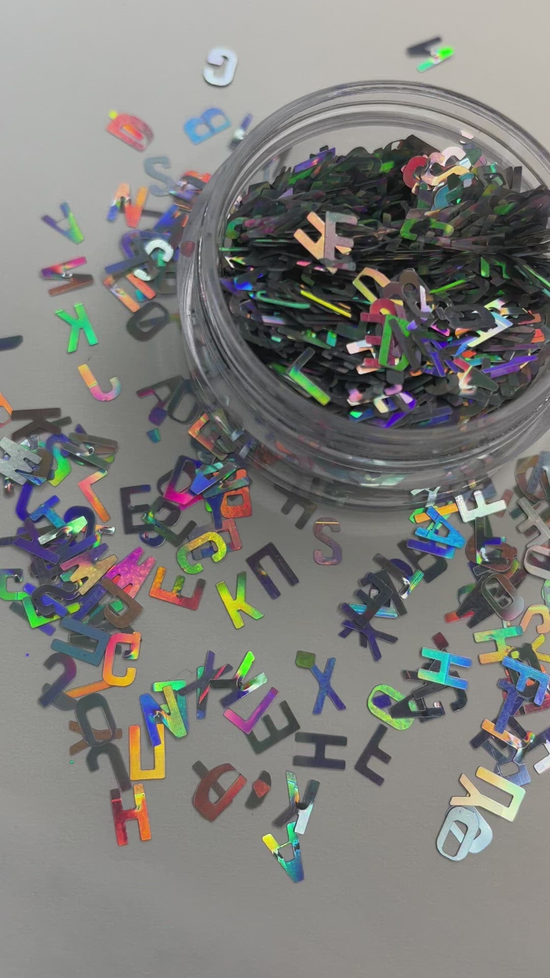 This product is a loose glitter, but its much more than that. Jam packed with every letter of the alphabet (in capital letters), you can spell any message you want on your nails with these holographic letters.